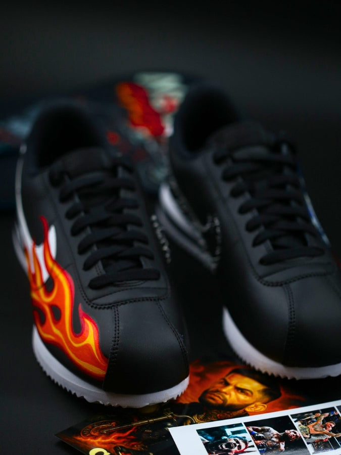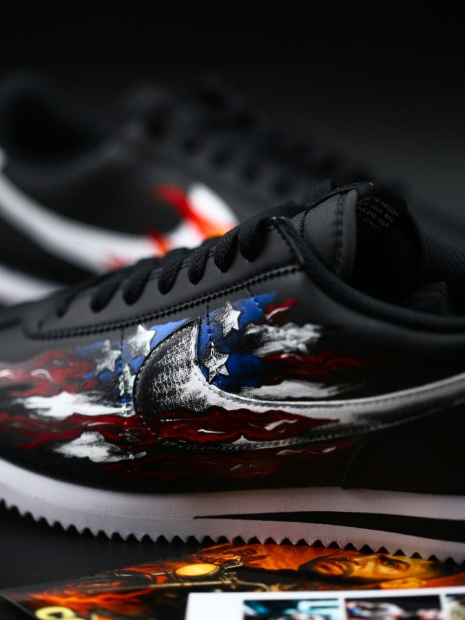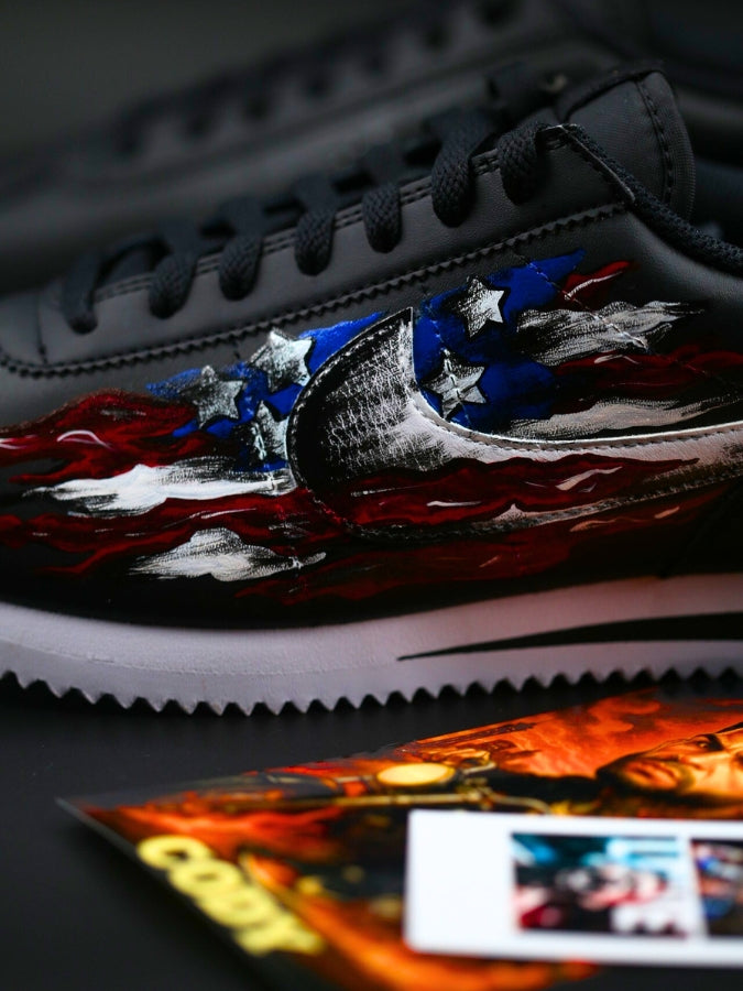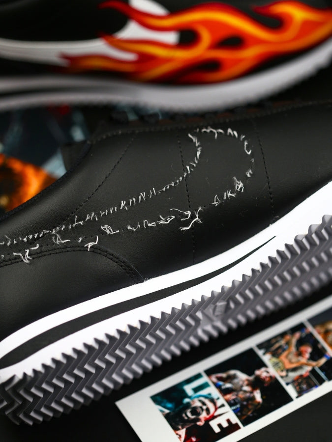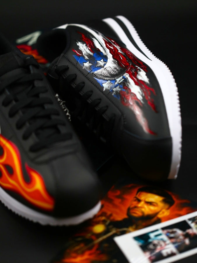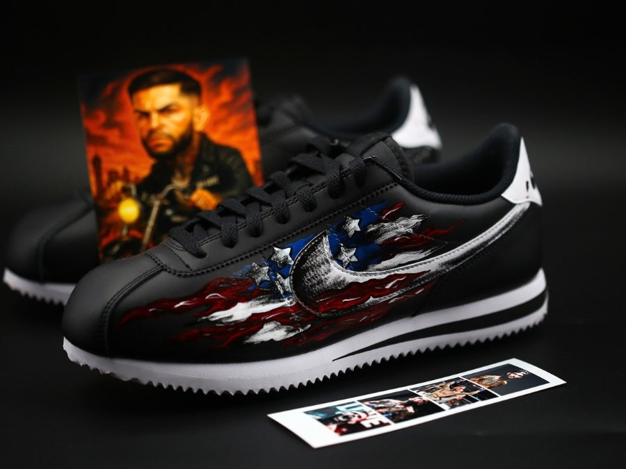 This one-of-a-kind pair of Cody No Love Custom Cortez captures the raw energy of the fight — red-hot flames symbolising power and motion, and the distressed American flag hand-painted in Angulus leather paints as a tribute to courage and individuality.